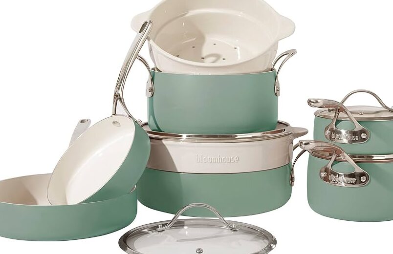 - Ceramic: Offering a non-toxic option with great heat distribution capabilities, ceramic cookware is visually appealing with its glossy finish in shades of sage green. It’s essential to check for chip resistance if you choose this type.