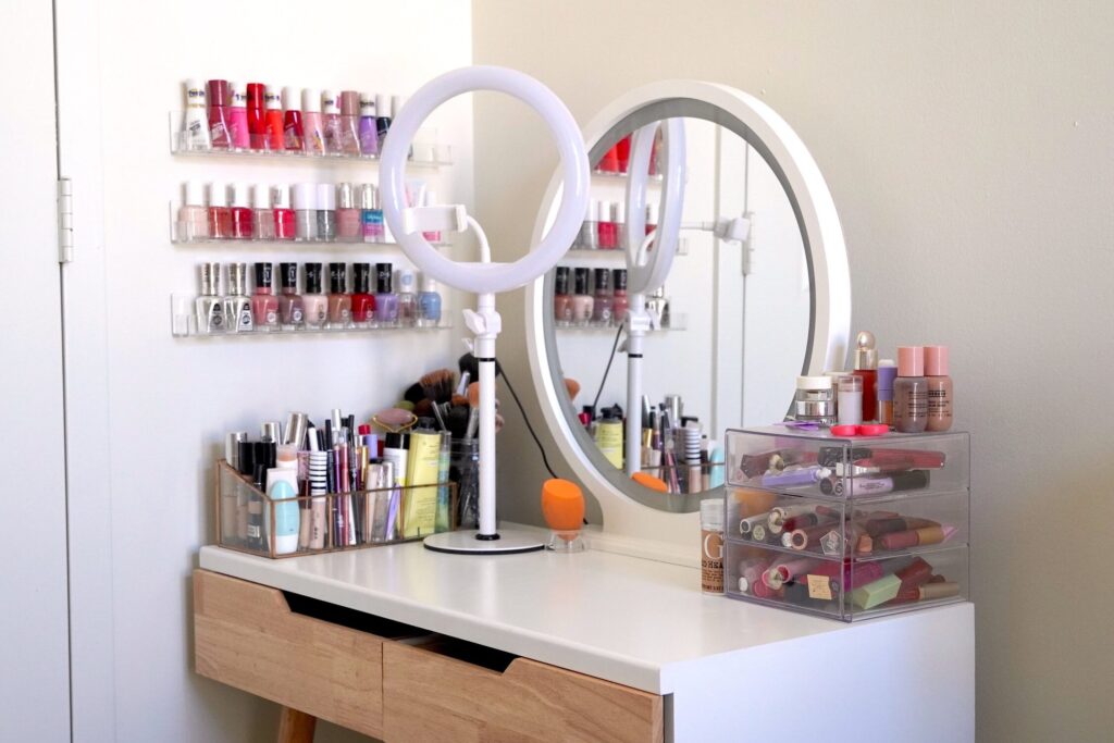 - Categorize by Type: Start by grouping similar products together-foundations, eyeshadows, blushes, and lip products should each have their designated area. This way, when we’re in the mood for a specific look or need to grab something quickly, everything will be easy to locate.